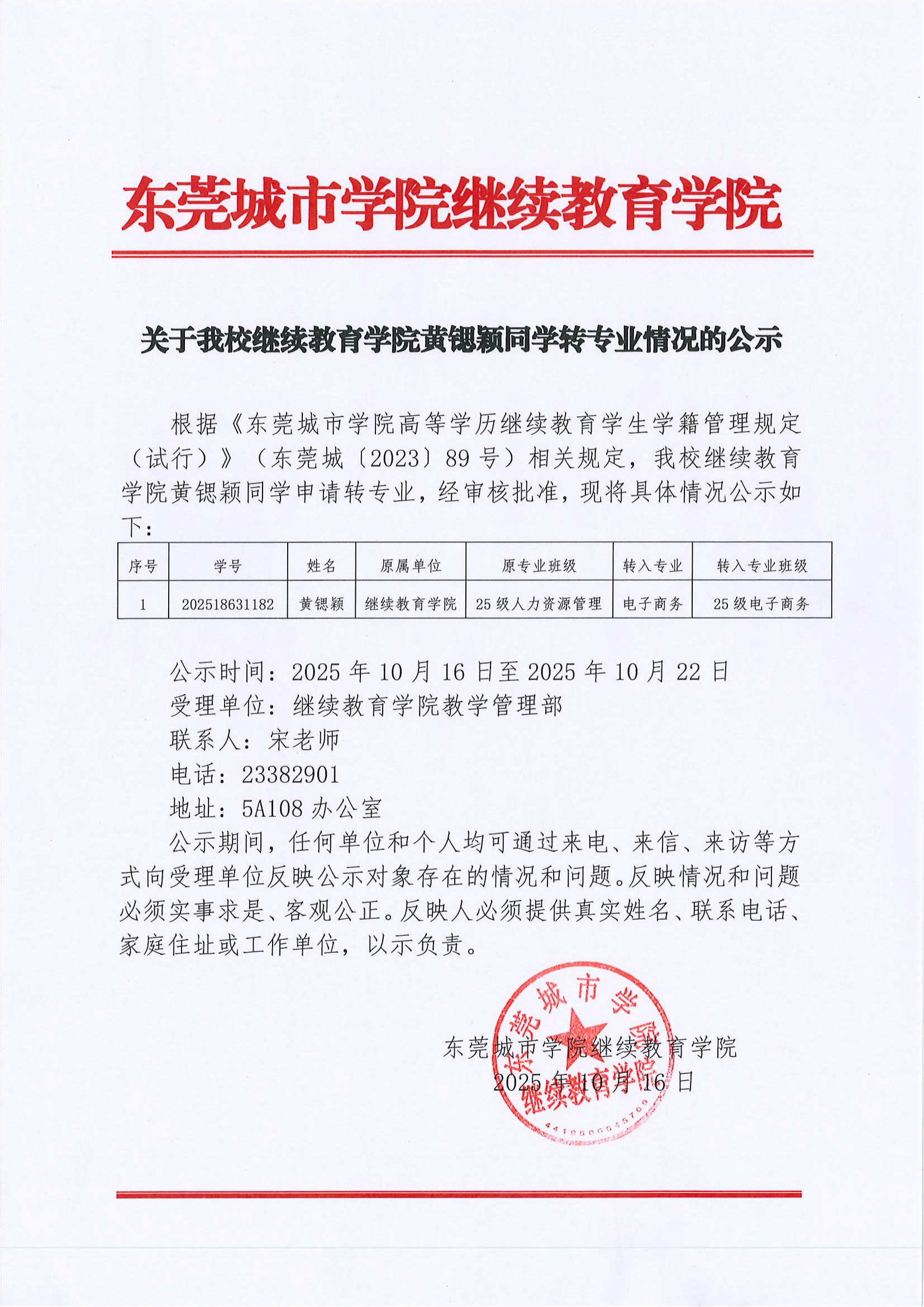 关于我校继续教育学院黄锶颖同学转专业情况的公示